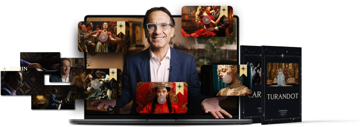 Em aulas de aproximadamente 30 minutos para que você tenha uma imersão completa no drama da ópera;